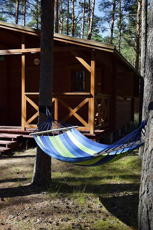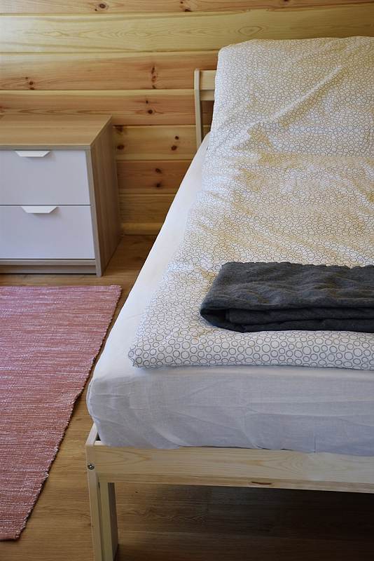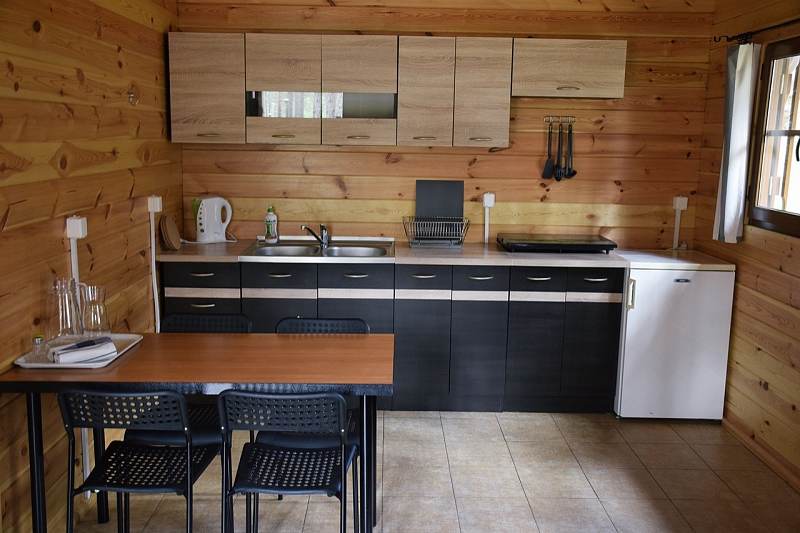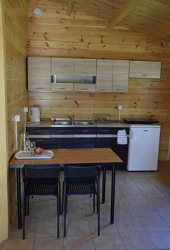 Sypialnia (dwa łóżka pojedyńcze, pościel dostępna), salonik (rozkładana kanapa). Domek oferuje aneks kuchenny z pełnym wyposażeniem, część jadalnianą i łazienkę.