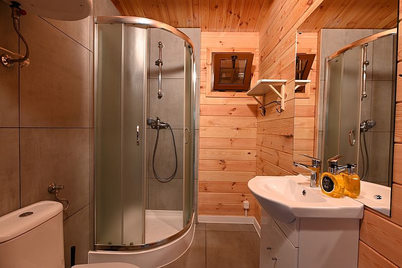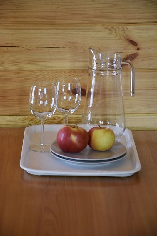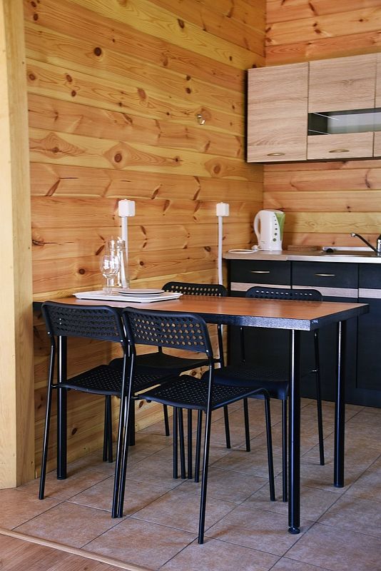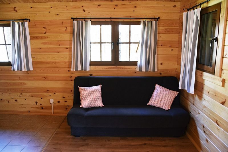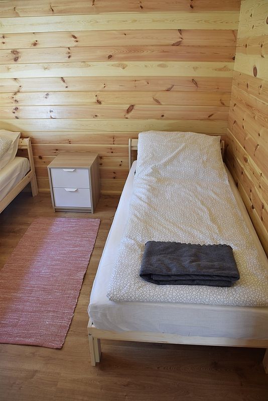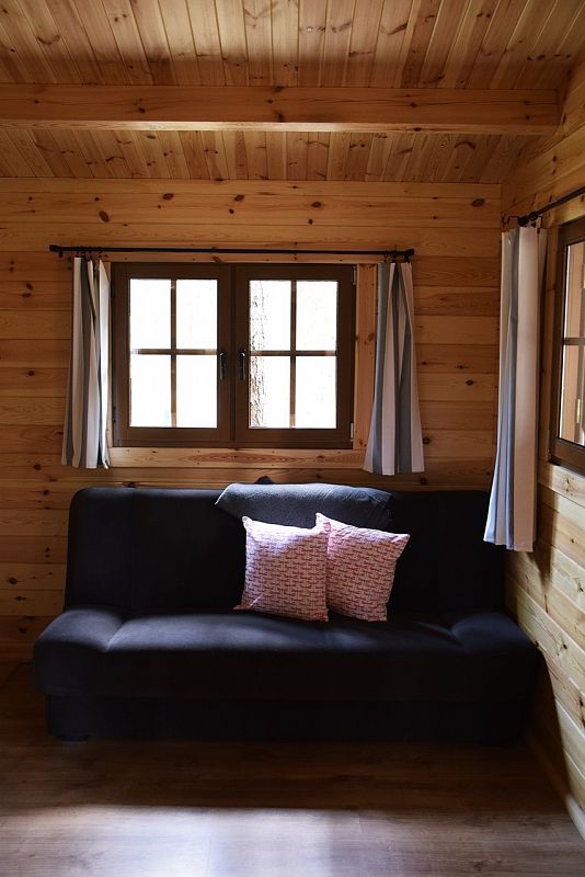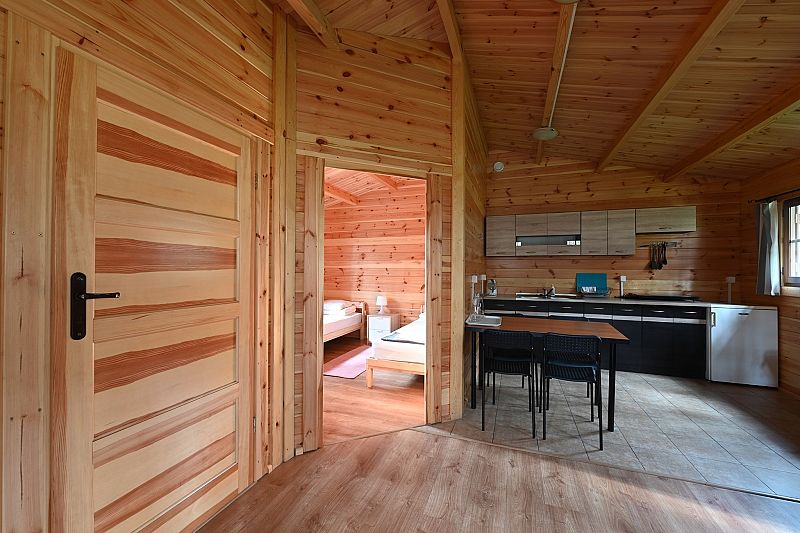 Sypialnia (dwa łóżka pojedyńcze, pościel dostępna), salonik (rozkładana kanapa). Domek oferuje aneks kuchenny z pełnym wyposażeniem, część jadalnianą i łazienkę.