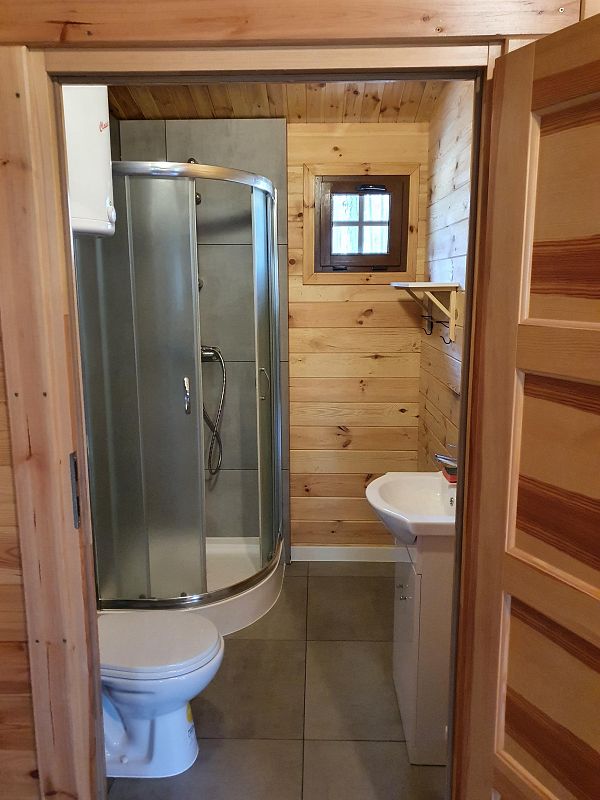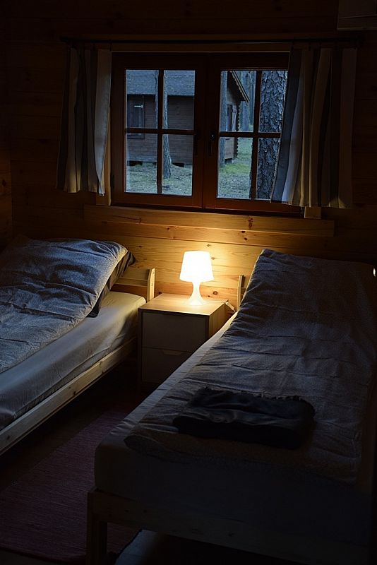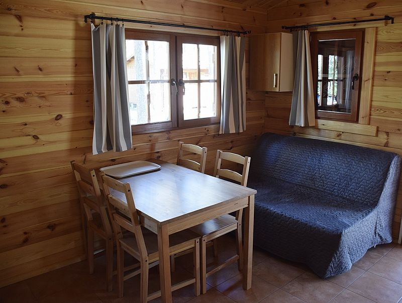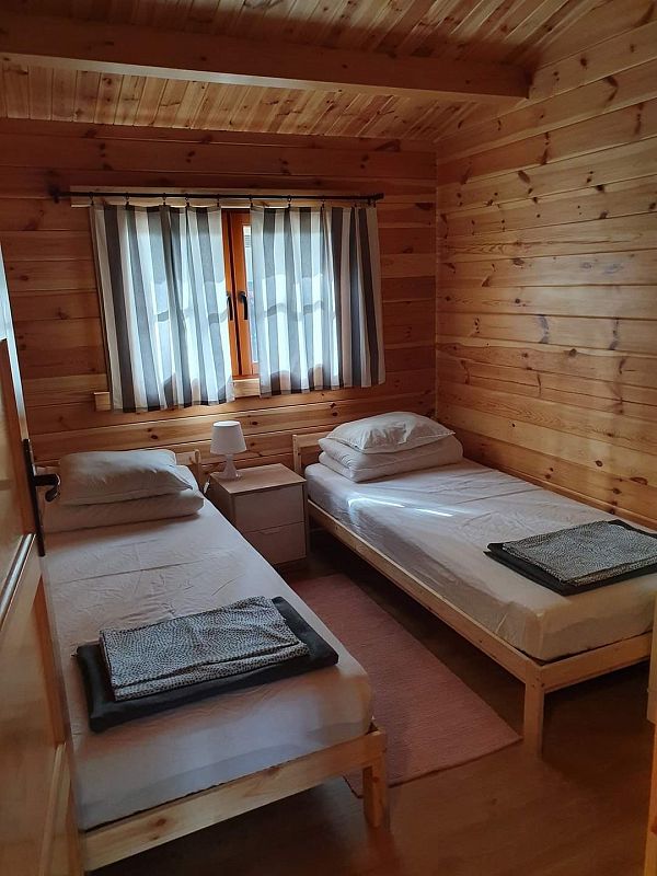 Dwie sypialnie (dwa łóżka pojedyńcze w każdej, pościel dostępna), salonik (rozkładana kanapa). Domek oferuje aneks kuchenny z pełnym wyposażeniem, część jadalnianą i łazienkę.