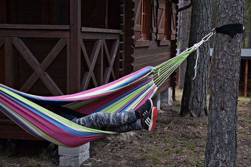 Przed domkiem taras z ławą i dostępny hamak.
